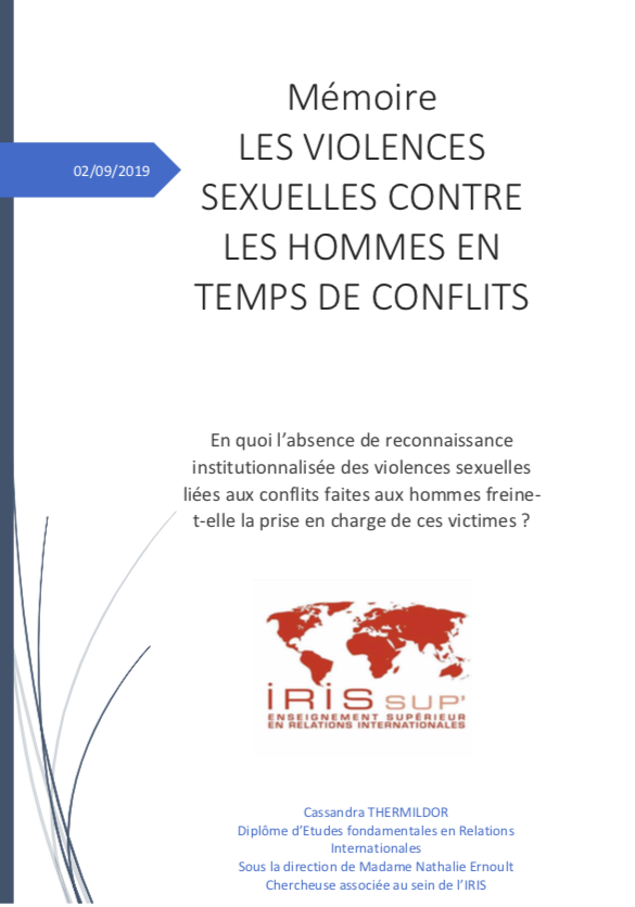 Pour lire le mémoire de Cassandra Thermildor, rédigé dans le cadre de son Master 1 à Iris Sup’ sous la direction de Madame Nathalie Ernoult, sur les violences sexuelles contre les hommes en temps de conflits : Les violences sexuelles contre les hommes en temps de conflits