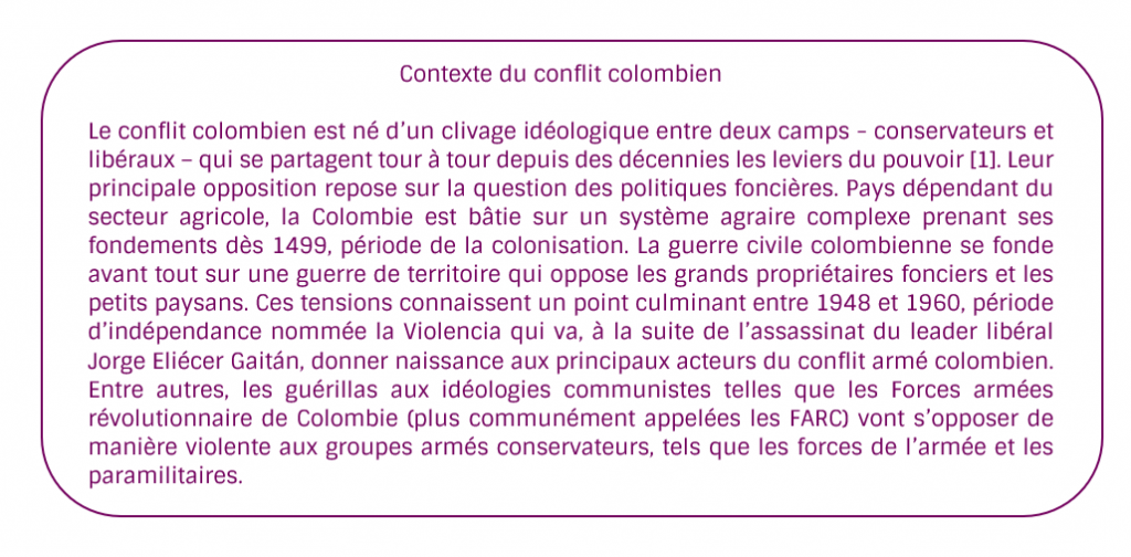 En Colombie, les représentations de la guerre ont progressivement donné naissance à des stéréotypes enfermant les femmes dans les rôles liés « aux soins », et les hommes dans celui « du combattant ». L’intérêt d’analyser ces stéréotypes à travers le prisme du genre permet de sortir de ce clivage et percevoir des réalités plus complexes. Le conflit interne colombien est une bonne illustration de cette problématique car il permet de dépeindre le rapport des femmes colombiennes à leur société. Bien que la population dans son ensemble soit touchée, ce sont les femmes, du fait de leur statut social et de leur sexe, qui sont souvent les principales victimes de violences tant sexuelles, que physique et psychique. L’évolution du rôle des femmes dans ce conflit, notamment au sein les guérillas communistes – au sein desquelles elles sont actrices principales – impose progressivement la problématique du genre dans les objectifs futurs du pays.