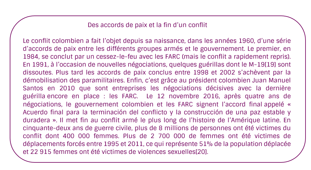 Le militantisme féministe a su se faire entendre lors des négociations pour la paix. En effet, les femmes ont progressivement trouvé leurs places dans les processus de paix jusqu’à celui de 2012 où les femmes sont enfin présentes aux tables des négociations.
