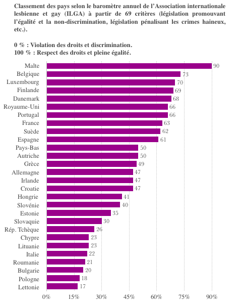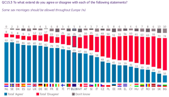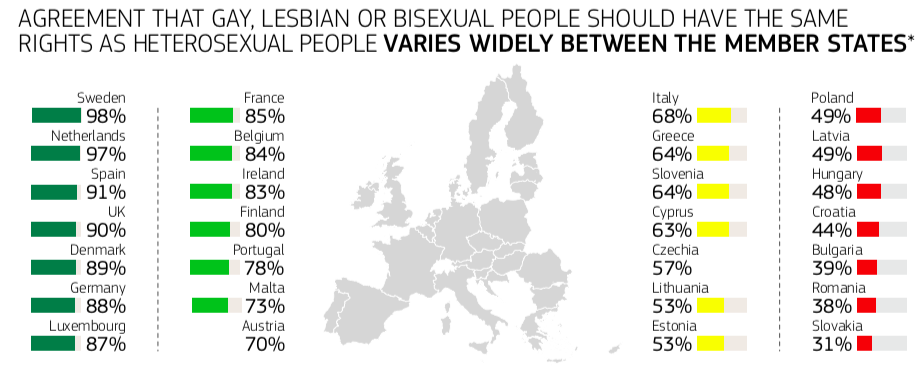 Étude demandée par la Commission européenne, Eurobarometer on Discrimination 2019 : The social acceptance of LGBTI people in the EU, National Data, 23 septembre 2019.
