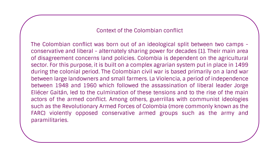 Pierre Hupet et Fabio Humberto GIRALDO JIMENEZ, Le conflit colombien acteurs, enjeux et perspectives, 2009, Annuaire français de relations internationales Annuaire français de relations internationales, Vol. 10, p. 827-843. Available at : https://www.afri-ct.org/wp-content/uploads/2010/07/Article_Hupet_et_Giraldo_Himenez.pdf