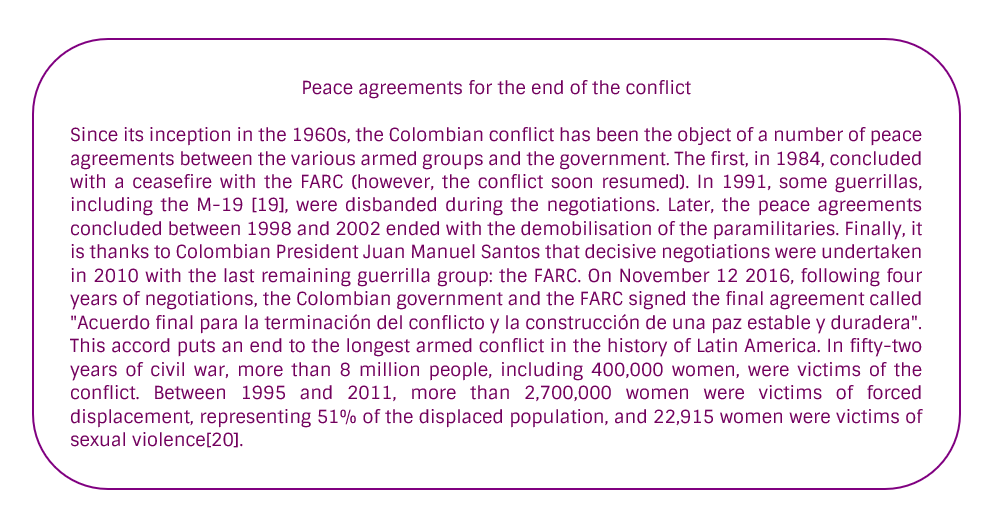 Feminist activism has made its voice heard in the peace negotiations. Indeed, women have gradually found their place in peace processes until 2012, where they were finally present at the negotiation tables.
